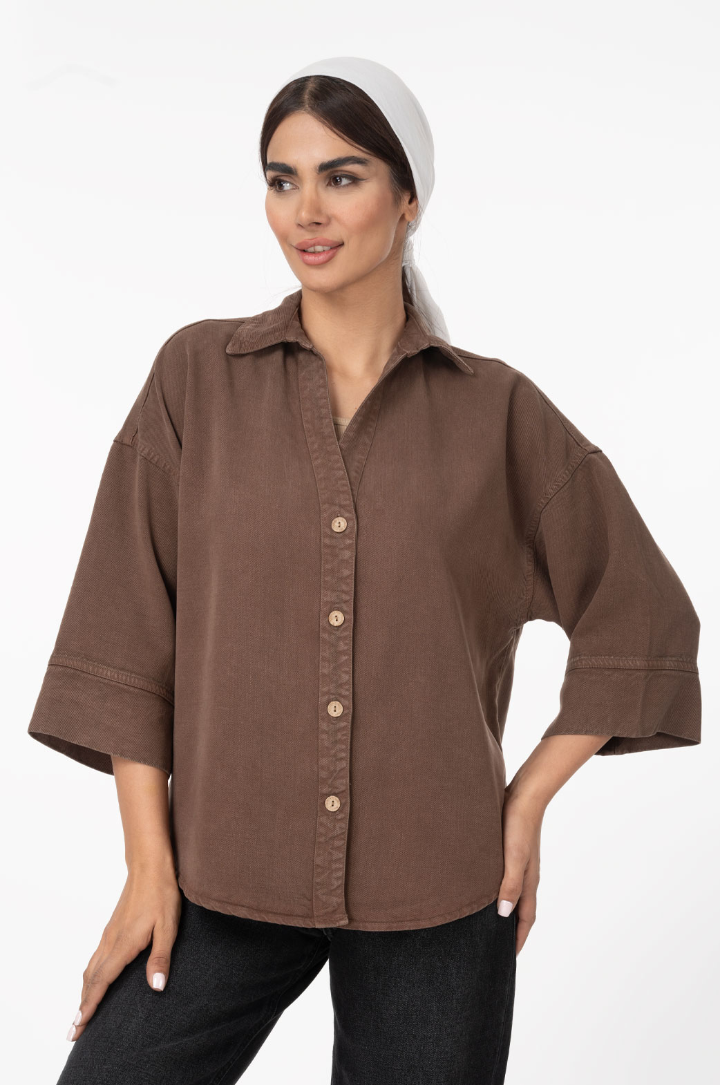 شومیز کتان سیلک ملورین پایین هلال گرم 2 پایین هلال بدون جیب قهوه ای تیره 0006504